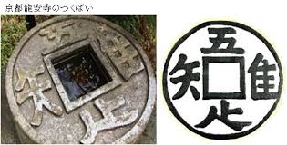 その方丈の軒下には、丸い石の真ん中が四角にくりぬかれ、その四角を口に見たてて時計回りに読むと、